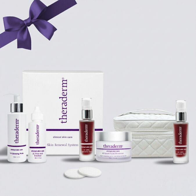 The holiday bundles are back! Treat yourself to the complete Skin Renewal System, featuring Gentle Moisturizer, plus an extra OPC Reparative Serum and a luxurious Theraderm toiletry bag.
