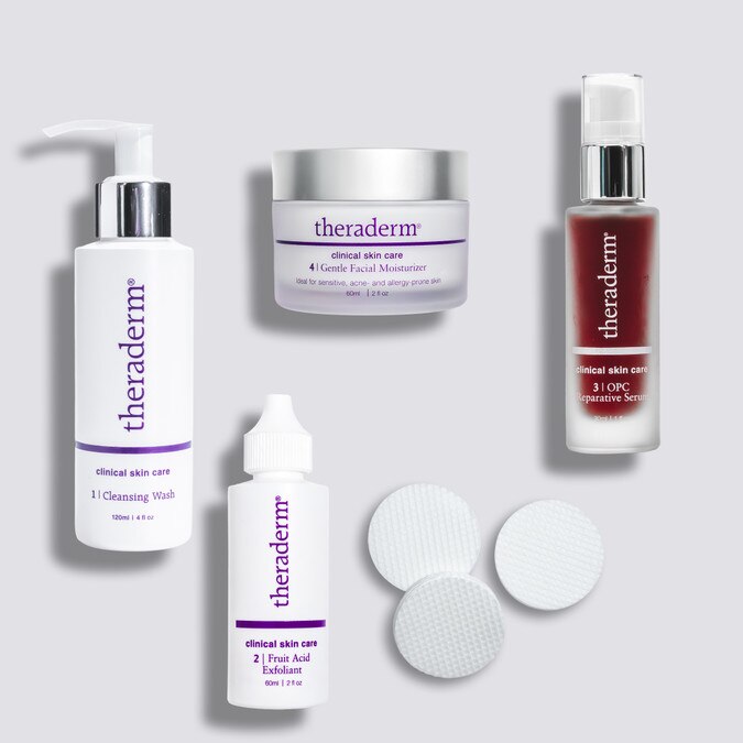Step 1: Cleanse. Apply one pump of Theraderm Cleansing Wash to a wet washcloth and gently cleanse face in a circular motion. Rinse and pat dry.