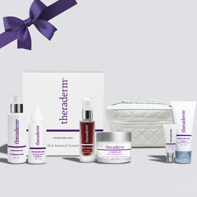 Treat yourself to the complete Skin Renewal System, featuring Peptide Hydrator, with NuPeel® and Anti-Aging Lip Complex in a luxurious Theraderm toiletry bag.