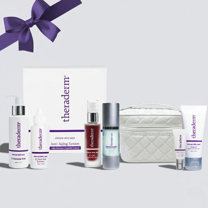 Treat yourself to the complete Skin Renewal System, featuring Eternox® Peptide Crème, with NuPeel® and Anti-Aging Lip Complex in a luxurious Theraderm toiletry bag.